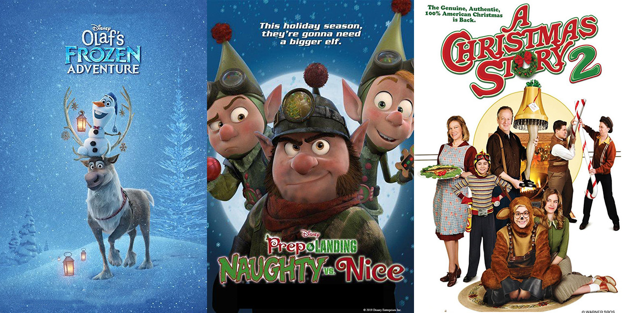 Screen on the GreenMovie posters for Olaf's Frozen Adventure; Prep & Landing: Naughty vs Nice; A Christmas Story 2